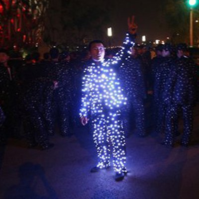 A performer in a light-bulb studded suit gestures to his teammates outside Beijing’s National Stadium, known as the Bird’s Nest, Tuesday July 15, 2008. Secretive rehearsals are underway in the stadium for the opening ceremony of the 2008 Olympic Games, which open on August 8. (AP Photo)