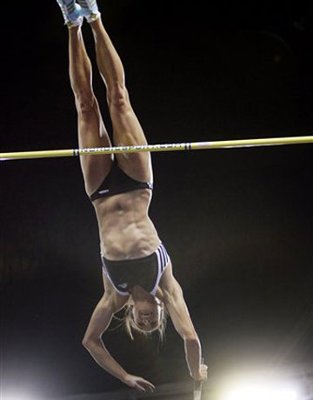 Russia’s Yelena Isinbaeva jumps to set the new World record at the pole vault competition at the Track and Field Golden Gala meeting in Rome’s Olympic stadium, Friday, July 11, 2008. Isinbaeva cleared the record height (5.03 meters; 16 feet, 6 inches) with ease on her second attempt Friday at the Golden Gala meet, nearly three years after her previous record of 16-5 1/4 (5.01 meters) at the 2005 world championships in Helsinki, Finland. (AP Photo/Andrew Medichini)