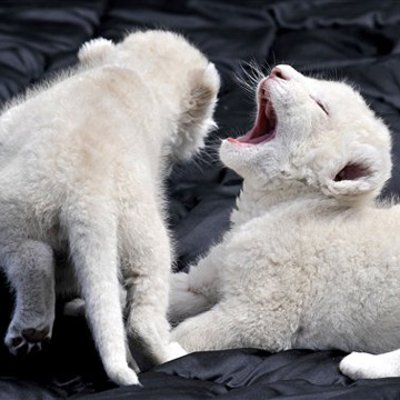A rare white lion cub yawns as three lion cubs are presented to the media at the Safaripark in Schloss Holte-Stukenbrock, western Germany, Monday, July 14, 2008. A total of seven white lion cubs have been born at the park by two mothers the same day on June 30, 2008. While three cubs are raised by their mother ‘Kibo’, the four other cubs were refused by their mother ‘Mawensi’. One of them died overnight Monday, the remaining three will be raised by the park’s animal keepers. (AP Photo/Martin Meissner)