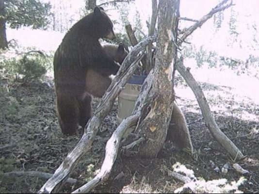 Everyone needs a helping hand from time to time. In this case, we see a mama bear helping their young bear grab some food.