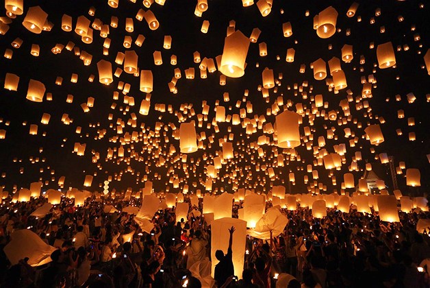 Nov. 27, 2012: Thousands of Khom Loy paper lanterns rise into the night sky during the Loy Krathong Buddhist festival in Chiang Mai, Thailand, on Nov. 24. An ancient tradition in northern Thailand, launching paper lanterns symbolizes letting go of your troubles & bad luck. Tourists & locals alike flock to the festival every year. (© Paul Brown/Rex Features)
