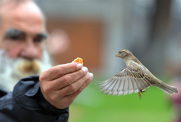 Nov. 20, 2012: A man feeds a sparrow in the garden of El Prado Museum in Madrid on Nov. 16. (© Dominique Faget/AFP/Getty Images)