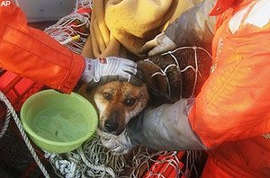 Rescuers flying over an island of debris rescue a dog swept out to sea by Japan’s tsunami three weeks ago.