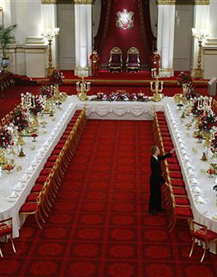 Finishing touches are completed, as the Ballroom at Buckingham Palace is set up for a State Banquet in London, Friday, July 25, 2008. For the first time ever, summer visitors to Buckingham Palace will be able to view how the room is set up for an official State Banquet, when The Queen entertains around 170 guests on the first evening of a State Visit. (AP Photo/Kirsty Wigglesworth)