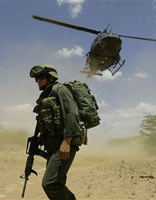 A member of a counter narcotics police unit walks along an illegal airstrip in Uribia, northeastern Colombia, near the border with Venezuela, Thursday, July 24, 2008. Colombian police destroyed four clandestine airstrips used by drug traffickers. (AP Photo/Fernando Vergara)